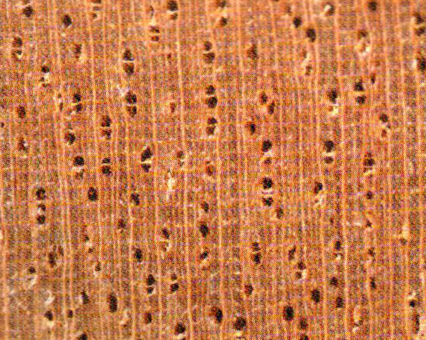 散孔材。管孔肉眼下可(kě)見,略多(duō),略小(xiǎo);主為(wèi)短徑列複管孔(2~3個),少數單管孔。軸向薄壁組織放大鏡下可(kě)見,弦向細線(xiàn)狀,與木(mù)射線(xiàn)構成網狀。木(mù)射線(xiàn)放大鏡下明顯,略密,窄。