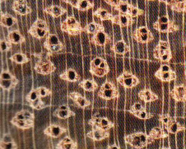 散孔材。管孔肉眼下明顯,少,略大;主為(wèi)單管孔,少數經列或斜列複管孔(2~3個);具(jù)黑色樹膠及硫黃色沉積物(wù)。軸向薄壁組織肉眼下明顯,發達,翼狀、聚翼狀及輪界狀。木(mù)射線(xiàn)放大鏡下明顯,密度中(zhōng),甚窄。