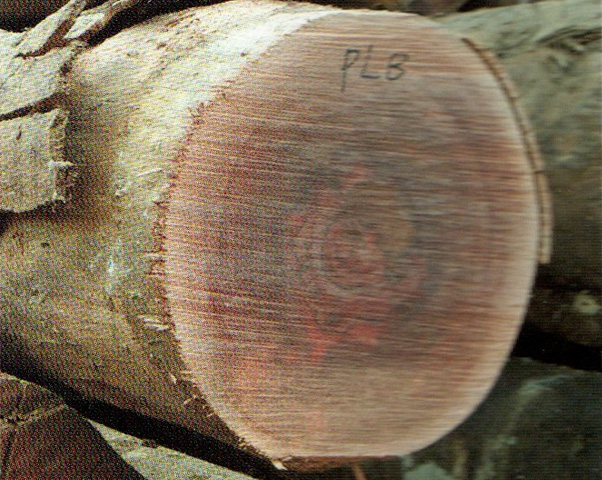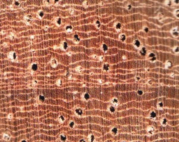 心邊材略明顯。心材暗紅褐色帶紫色調,心部具(jù)不規則花(huā)紋。邊材色稍淺,寬3~4cm。生長(cháng)輪略明顯,輪間界以深色組織帶。